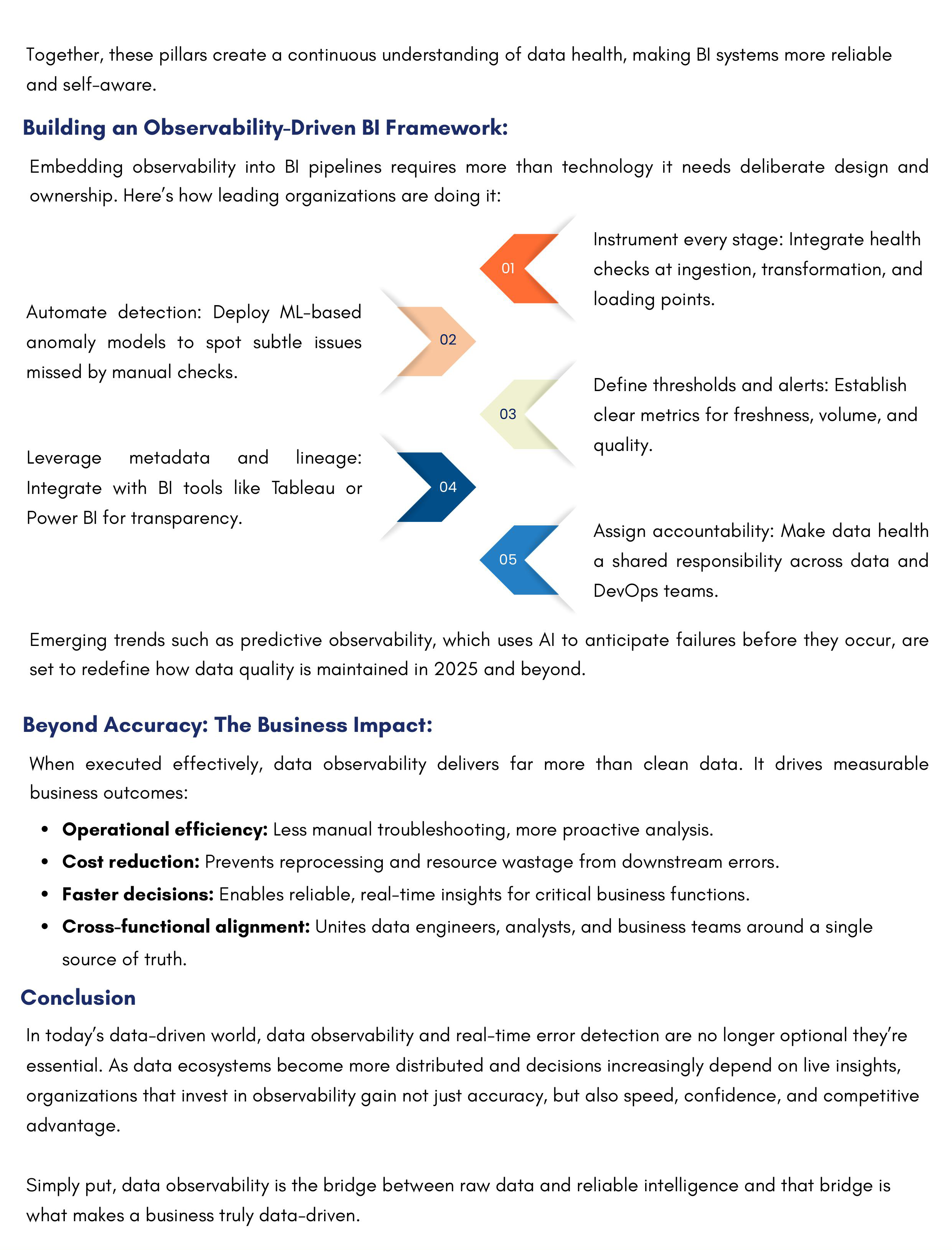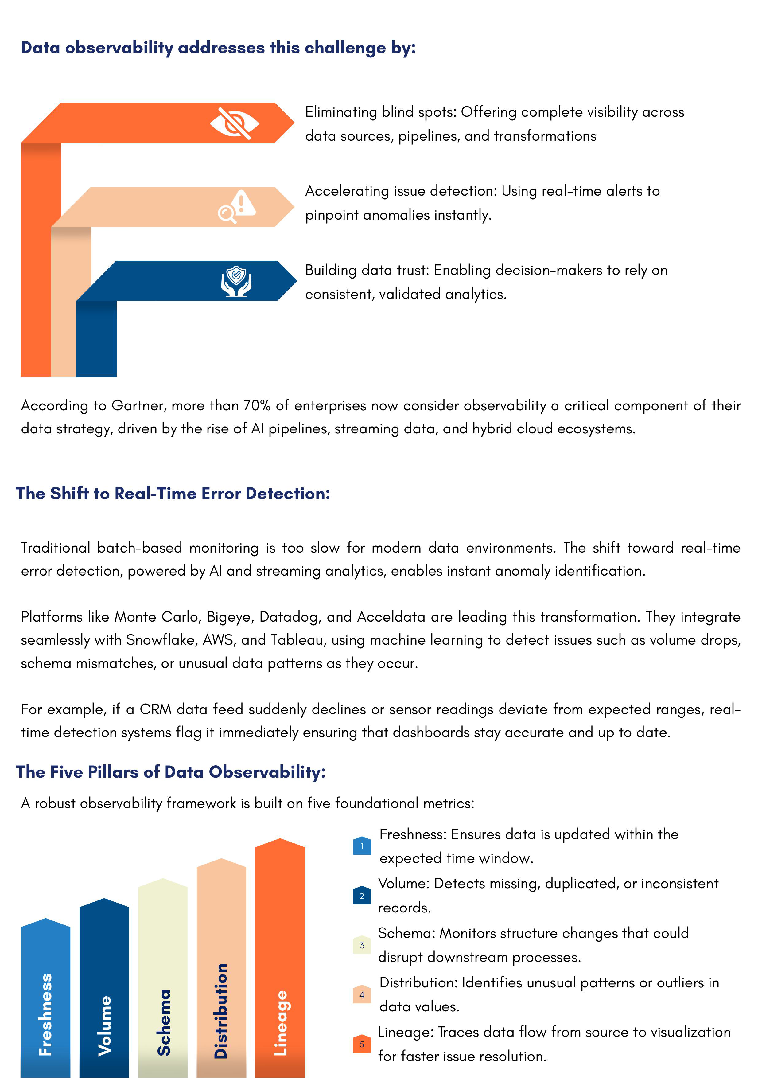 Download PDFIn analytics today, data’s value lies not just in its availability but in its reliability. Every dashboard, KPI, and predictive model depends on the integrity of the underlying pipeline. As organizations scale, managing data health across increasingly complex systems becomes a growing challenge. This is where data observability and real-time error detection transform how Business Intelligence (BI) teams maintain accuracy, speed, and trust..