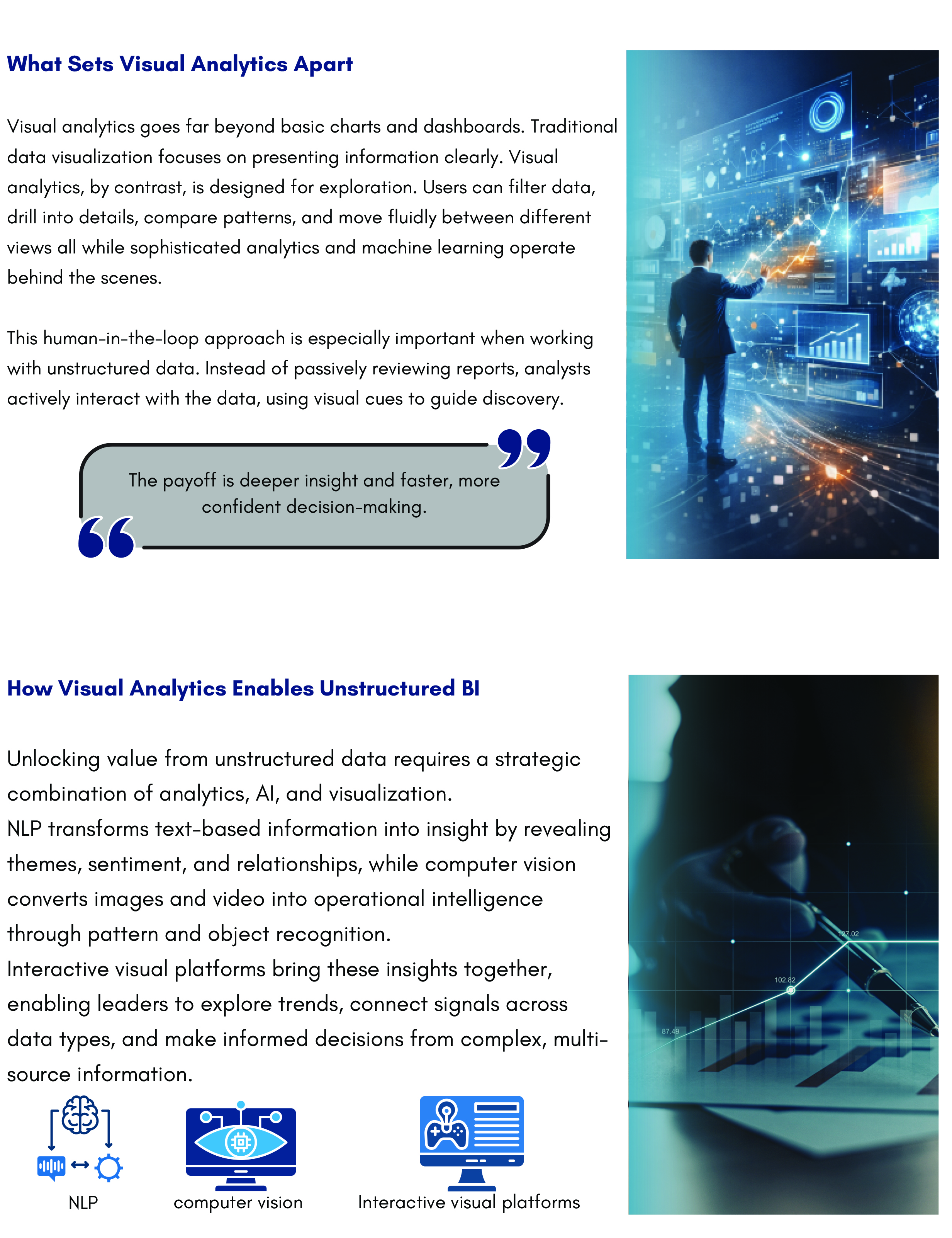Visual analytics elevates decision-making by uniting advanced analytics with intuitive visual exploration, enabling leaders to extract meaningful insight from complex, unstructured sources that conventional BI approaches are unable to address.