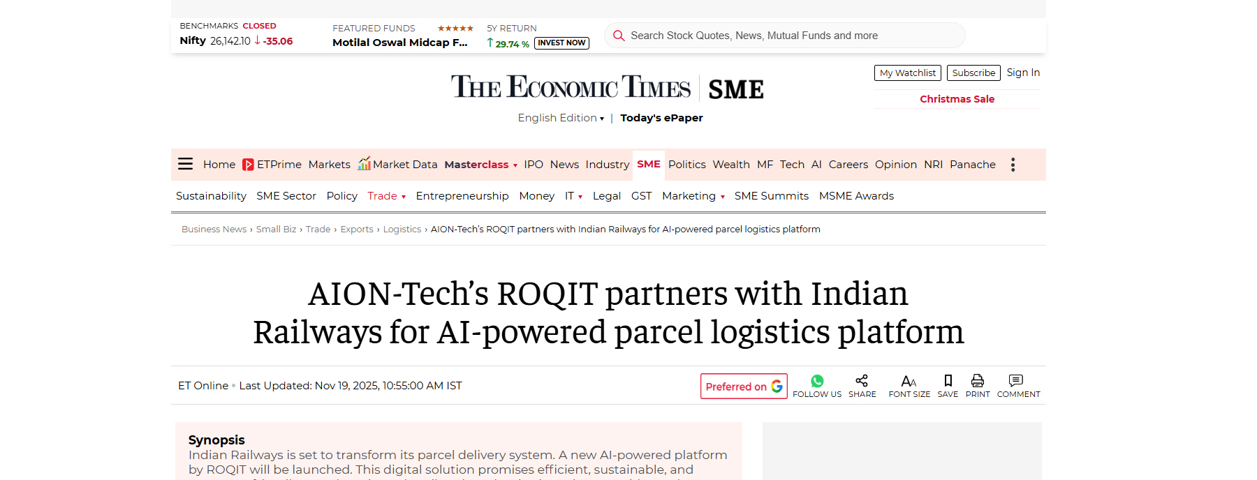 Aion Tech’s ROQIT Partners with Indian Railways for AI-Powered Parcel Logistics Platform