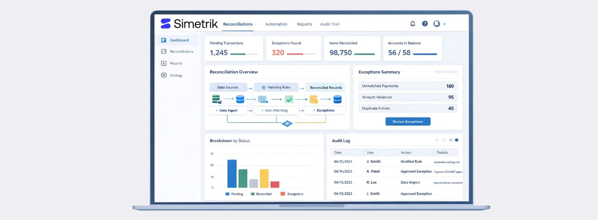 Simetrik provides AI-powered, No-Code for reconciliation & financial close specialized in high transactional businesses and across complex payment workflows. It enables finance and operations teams to automate transaction matching, exception handling, and generate accurate reports seamlessly across banks, payment service providers, ERPs, and payment networks delivering greater visibility, control, and efficiency at scale.